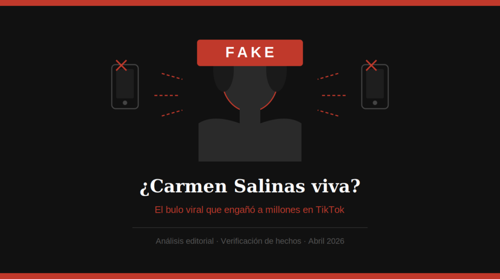 Este artículo tiene fines exclusivamente informativos y de análisis crítico sobre un fenómeno de desinformación en redes sociales. Carmen Salinas Lozano falleció el 9 de diciembre de 2021 en la Ciudad de México, hecho confirmado públicamente por su familia y por medios de comunicación nacionales e internacionales. El contenido aquí publicado NO afirma, promueve ni sugiere que la actriz se encuentre con vida. Los videos virales analizados corresponden a contenido generado o manipulado digitalmente. Este medio rechaza y condena la difusión de información falsa. |